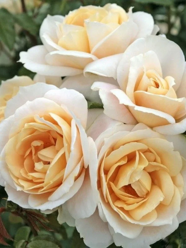 Куст имеет компактную форму, вырастая в высоту до 60 сантиметров, ширина составляет 50-60 сантиметров. Стебли густо покрыты зелеными кожистыми листьями. Обильное эффектное цветение продолжается до первых осенних заморозков. Цветки собраны в кремово-белые соцветия, они имеют классическую форму с повышенной серединой, которая подсвечена оранжевым оттенком. В раскрытом состоянии бутоны достигают 7-8 сантиметров в диаметре. Роза хорошо стоит в срезе и часто используется для создания нежных букетов. Культура обладает хорошей морозостойкостью и устойчивостью к заболеваниям, благодаря чему не составляет труда в уходе.